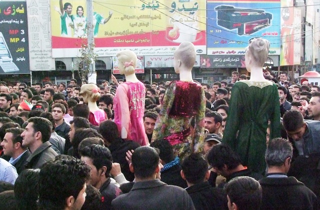 Rozhgar displays similar vision and fortitude in ‘Five Plastic Women Protestors’. She arranged for a group of male protestors to carry five plastic mannequins at a rally to protest against the Kurdistan Regional Government in Sulaymaniya’s Sara Square in 2011. Rozhgar directed this piece from a distance, using men to portray a message of gender equality. This piece of performance art enabled Kurdish women to exert their right to protest in absentia, in a milieu where it was not physically safe for them to do so. There is a strong sense of irony that silent mannequins have given Kurdish women a voice. What does it mean that the Plastic Women Protestors are being carried by men? Do you interpret this as supportive or indicative of the fact that, without men, women have no power in their own right?
