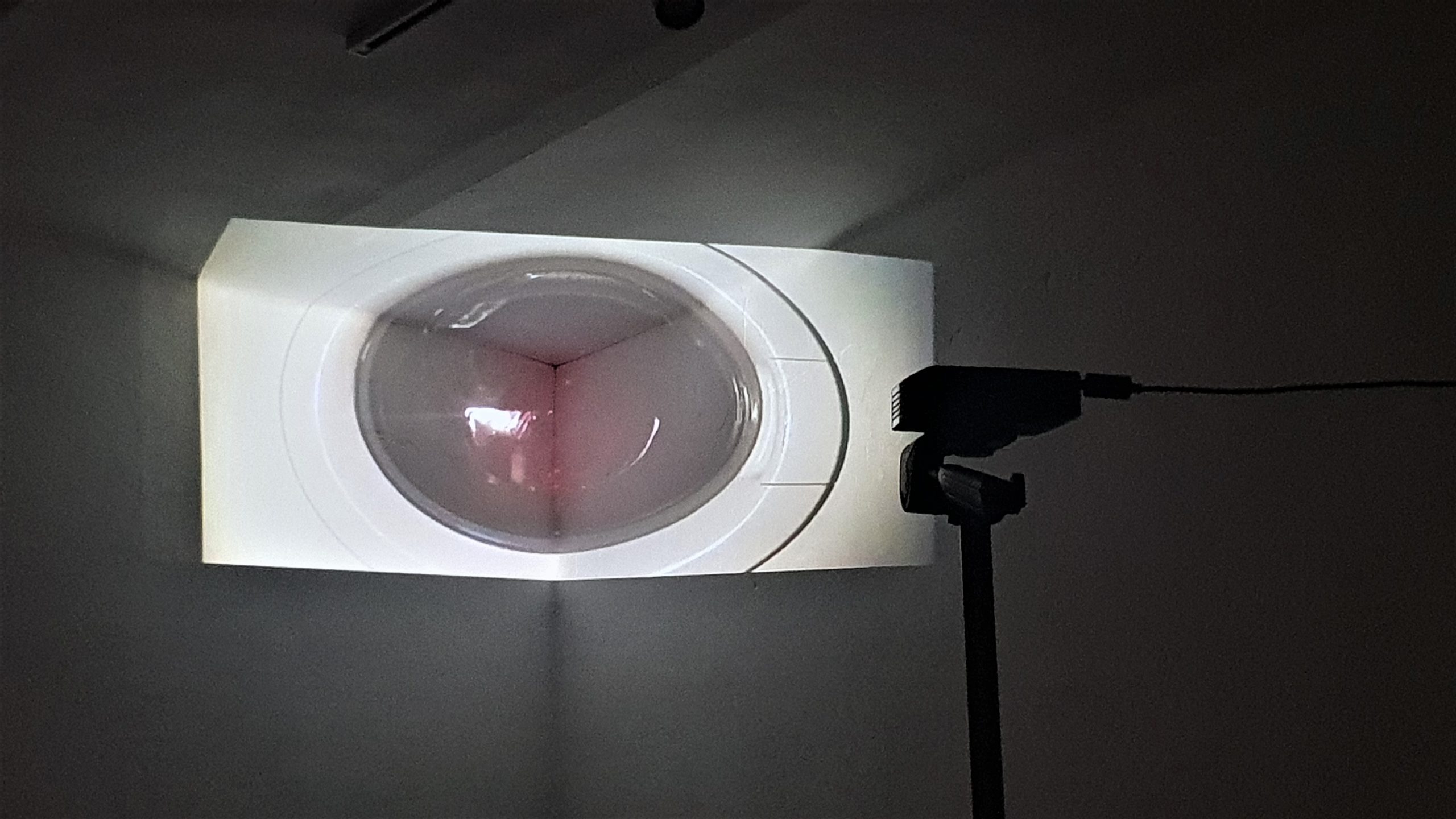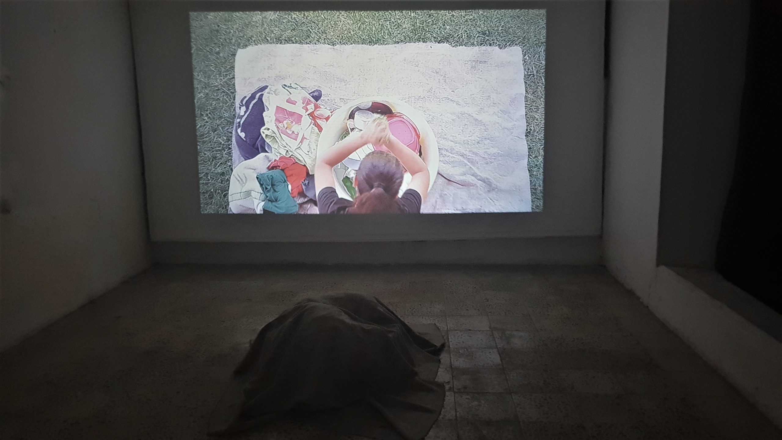 The video of washing machine located in a corner of the gallery. The corner has a triangle shape and the spinning circle of the washing machine around the tringle in the middle were a remarkable symbol. The materials chosen carefully and consciously, which point out the integration with the daily materials and how related to the females.( text by Avan Omar)