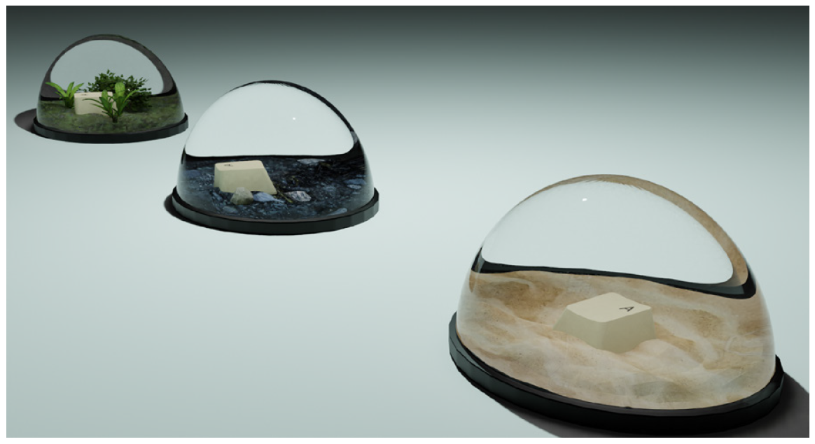 The Description: A ten minutes video work. Was made from various images, for instance, a drone, landscape and some digitally 3d modelling. The soundtrack is mostly entirely constructed with female narrative voices in English, German and French. The installation also consists of some sculptural elements representing language and hearing, like enlarged keyboard keys and earplugs. The video explores the subjective and manipulative features inherent to the art of subtitling, by prioritising occasionally some non-verbal information over the spoken script, and by allowing the soundscape and moving images to affect the way the captions appear or melt in the picture.