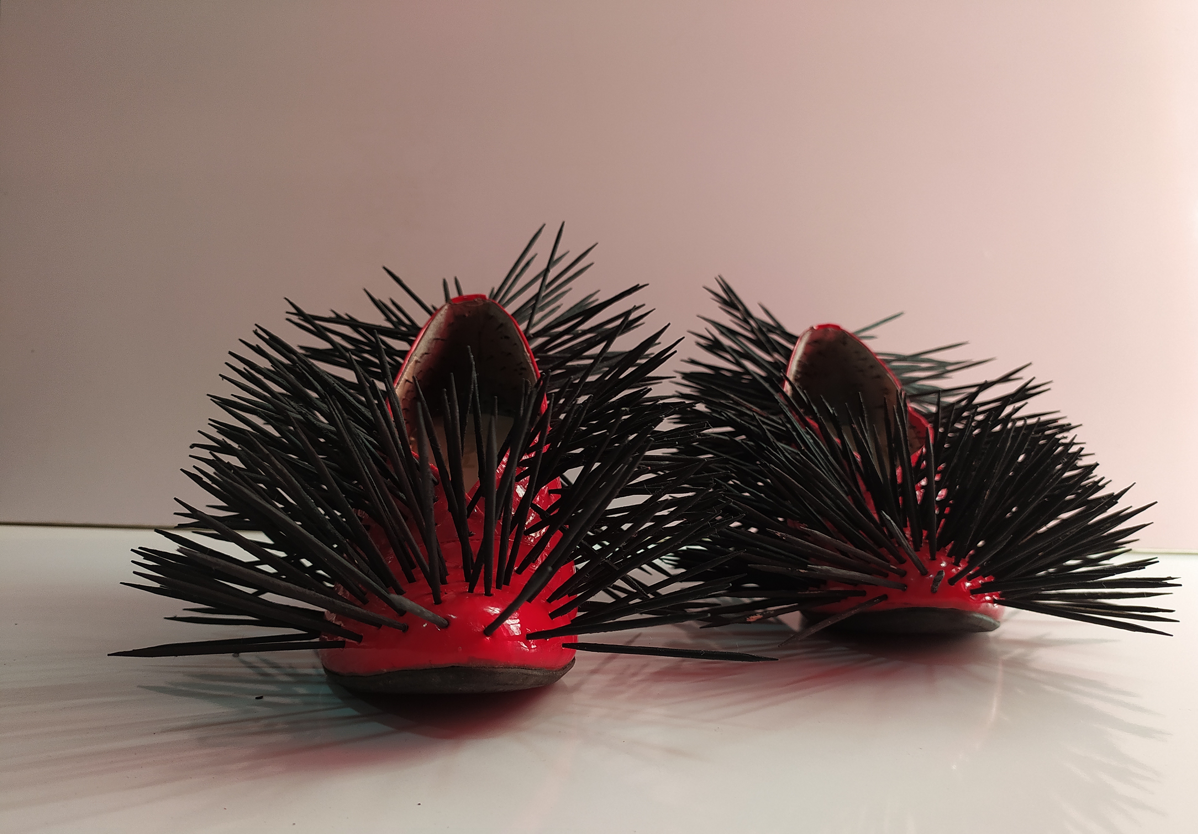Another piece of Sakar’s work that combines relatability, unfamiliarity and nuanced interpretations is Sorrow (2020). This artwork features red patent leather shoes pierced by toothpicks. There is a similar otherworldliness to this piece. I keep returning to a photo of the shoes; each time I realise a new interpretation. On a superficial level, again, prompted by relatability, Sorrow made me smile (now that’s an oxymoron!), as the day I started to put pen to paper for this article, a colleague came to work wearing the most amazing red, high-heeled shoes. She said wearing the shoes made her feel good about herself. However, I’m a flat shoe wearer, and all high-heeled women’s shoes bewilder me and, even seem slightly menacing. Red high-heeled shoes conjure highly sexualised images in my mind. Are the toothpicks there to protect the wearer from unwanted and unwarranted responses from men or are they barbs that are attacking the wearer for daring to flaunt her sexuality? Viewpoint is everything. Who decides which perspective is most valid?